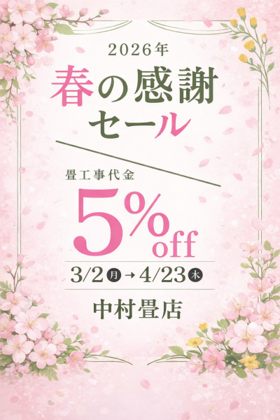 日頃のご愛顧に感謝を込めて、3月2日より畳工事代金5%OFFセールを開催しております。